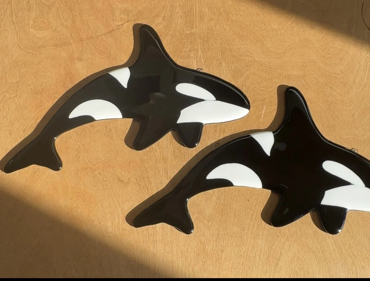 This fused glass Orca is handmade in the Cowichan Valley. Cut and fused opaque glass is secured using metal hooks for hanging in any window or opening.
